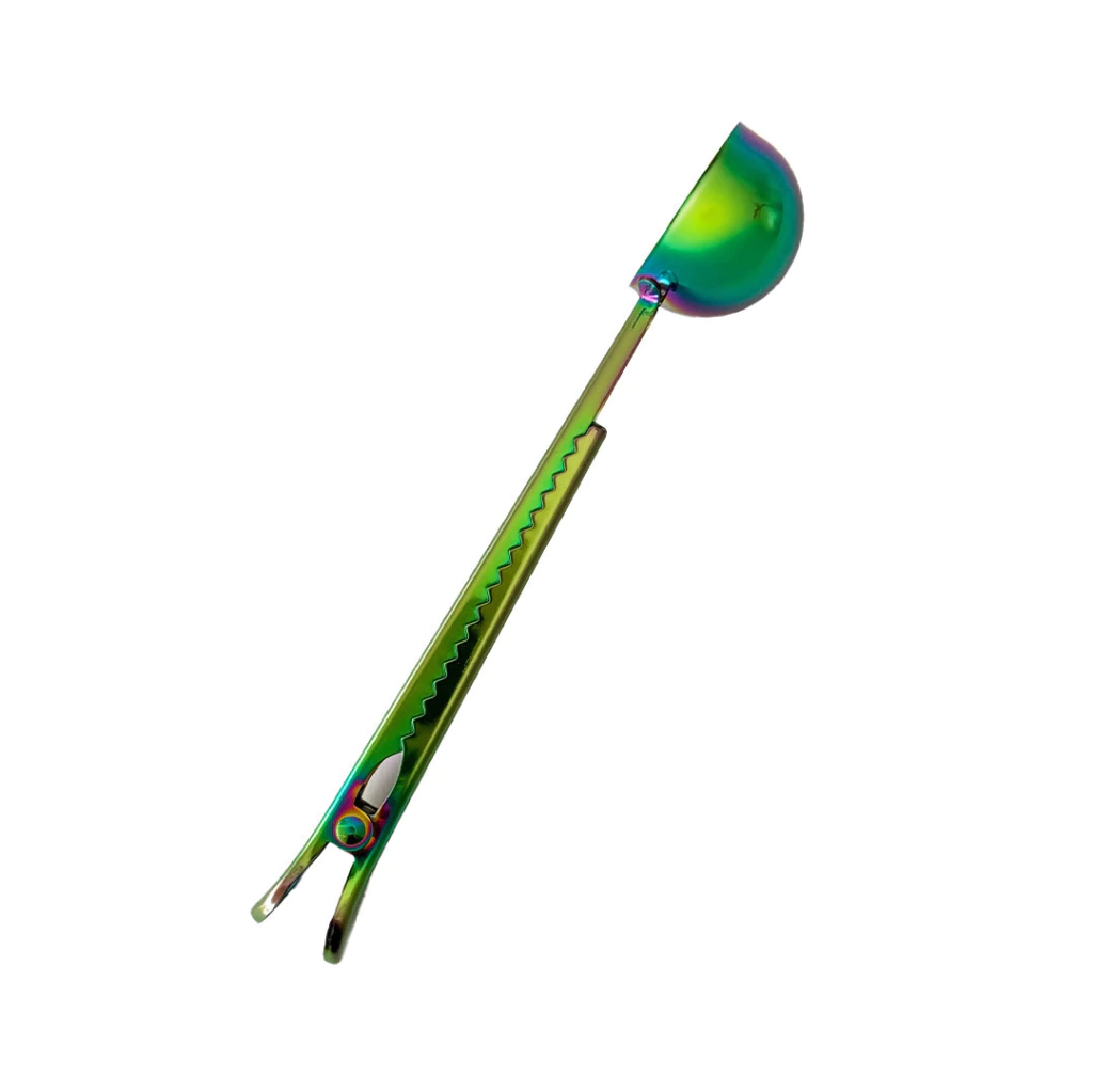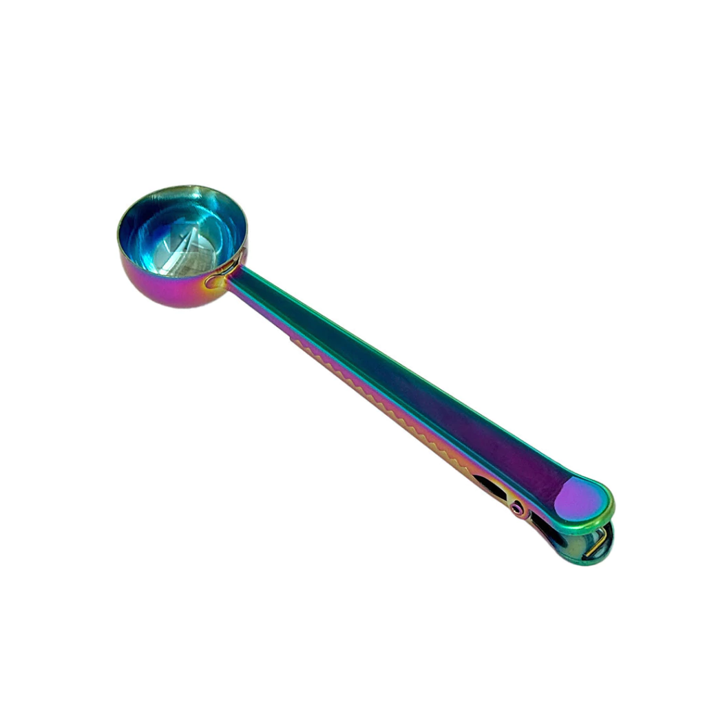 Fabricada en acero inoxidable, combina dos funciones en una sola herramienta: por un lado, sirve para medir café, leche en polvo u otros ingredientes; y por otro, funciona como clip para cerrar bolsas, ayudando a mantener tus alimentos frescos por más tiempo.