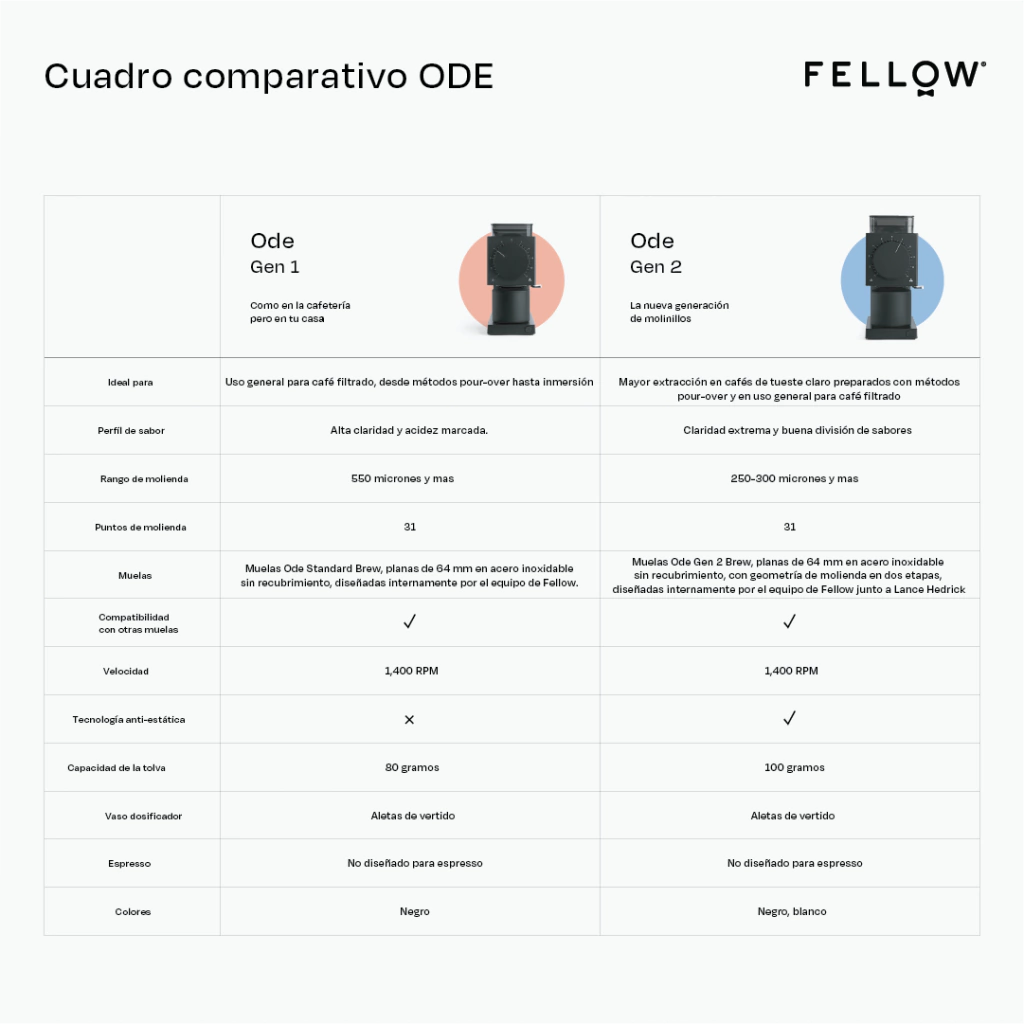 El Fellow Ode Gen 2 es la evolución del icónico molinillo de Fellow: más silencioso, más preciso y con una experiencia de uso aún más refinada. Diseñado para quienes buscan resultados profesionales en métodos de filtro como AeroPress®, dripper, prensa francesa o cold brew, este molinillo eleva tu ritual diario con rendimiento y diseño mejorados.